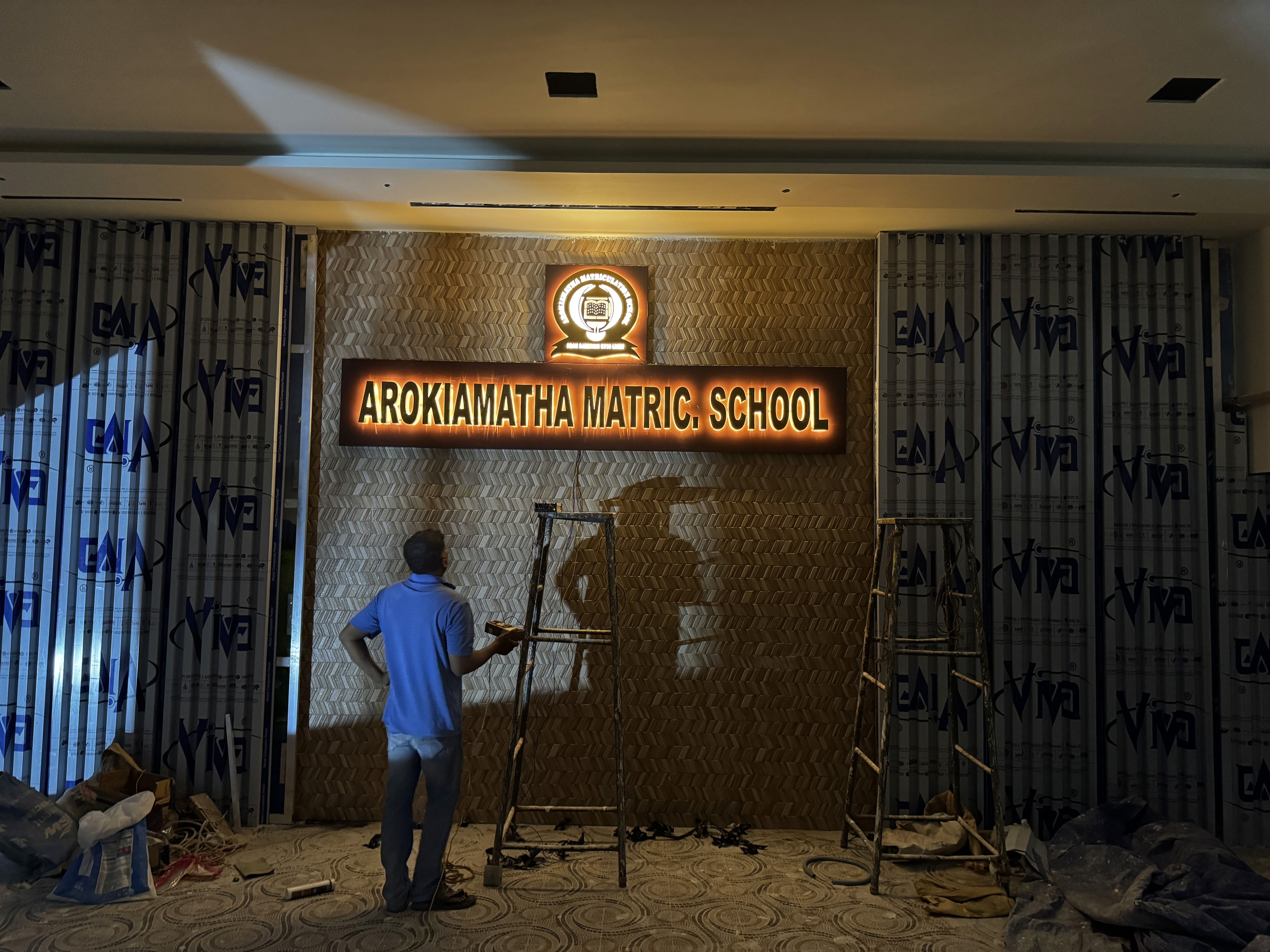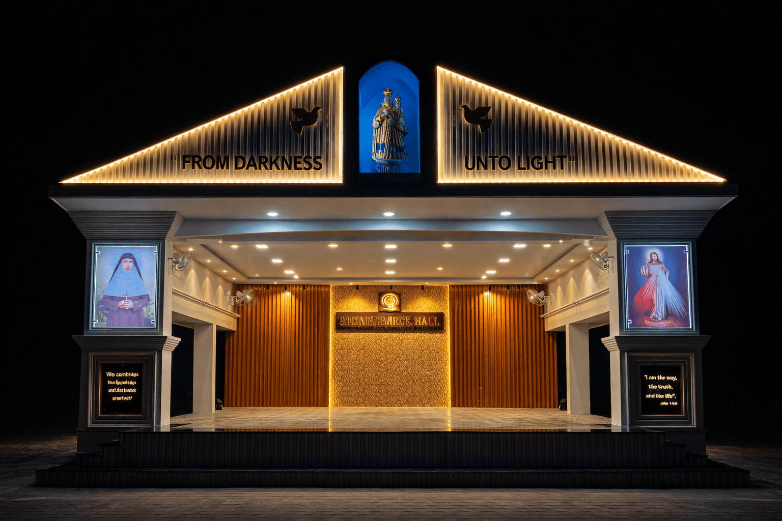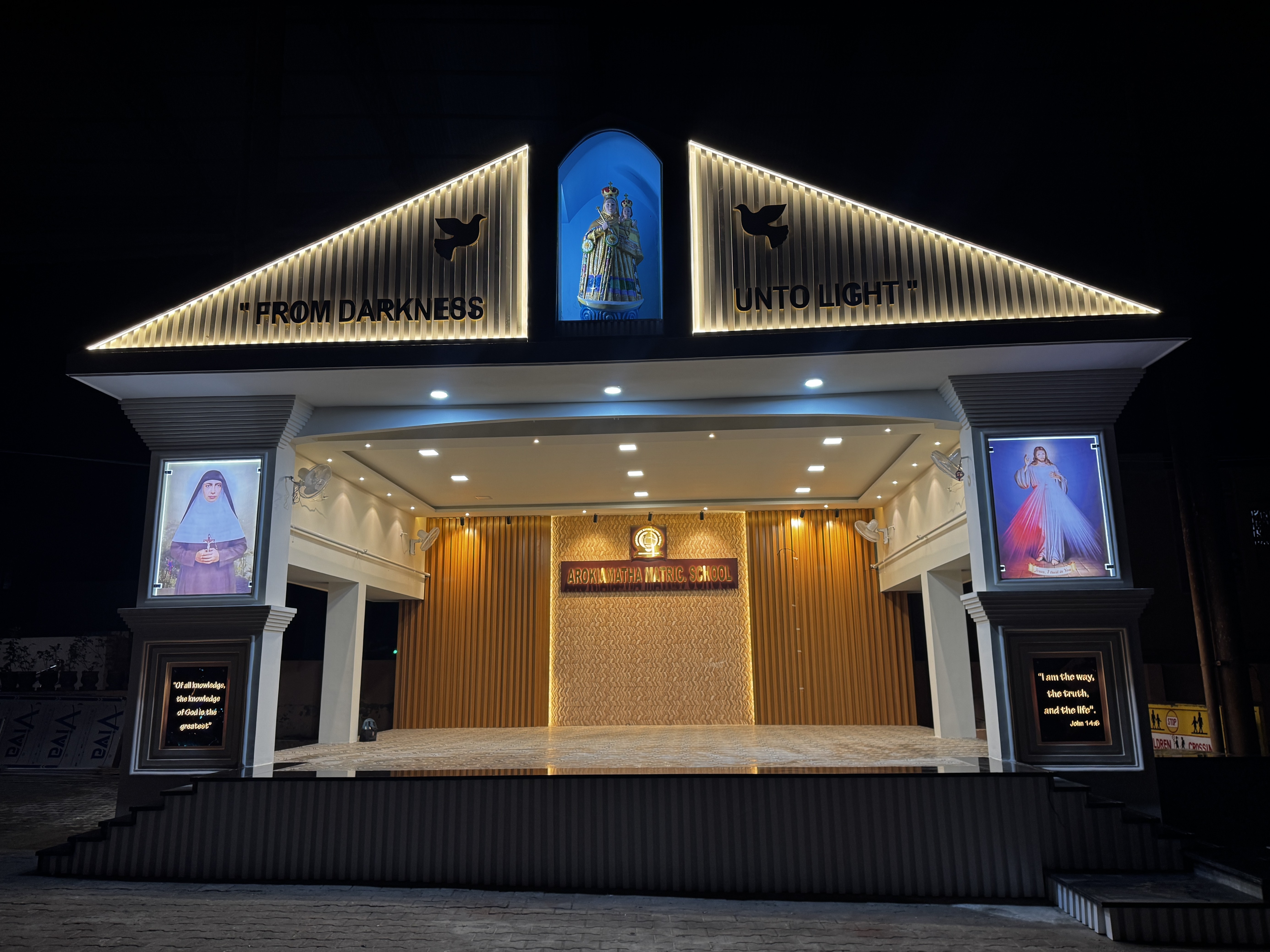 The completed transformation presents a strong and cohesive architectural identity for the institution. The illuminated stage façade and refined exterior detailing enhance the campus presence while creating a dignified and visually striking environment for school events and ceremonies. The result is a balanced blend of structure, symbolism, and lighting that reinforces the school’s values and elevates its overall aesthetic appeal.