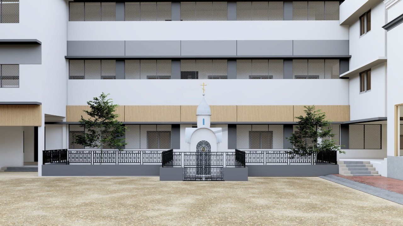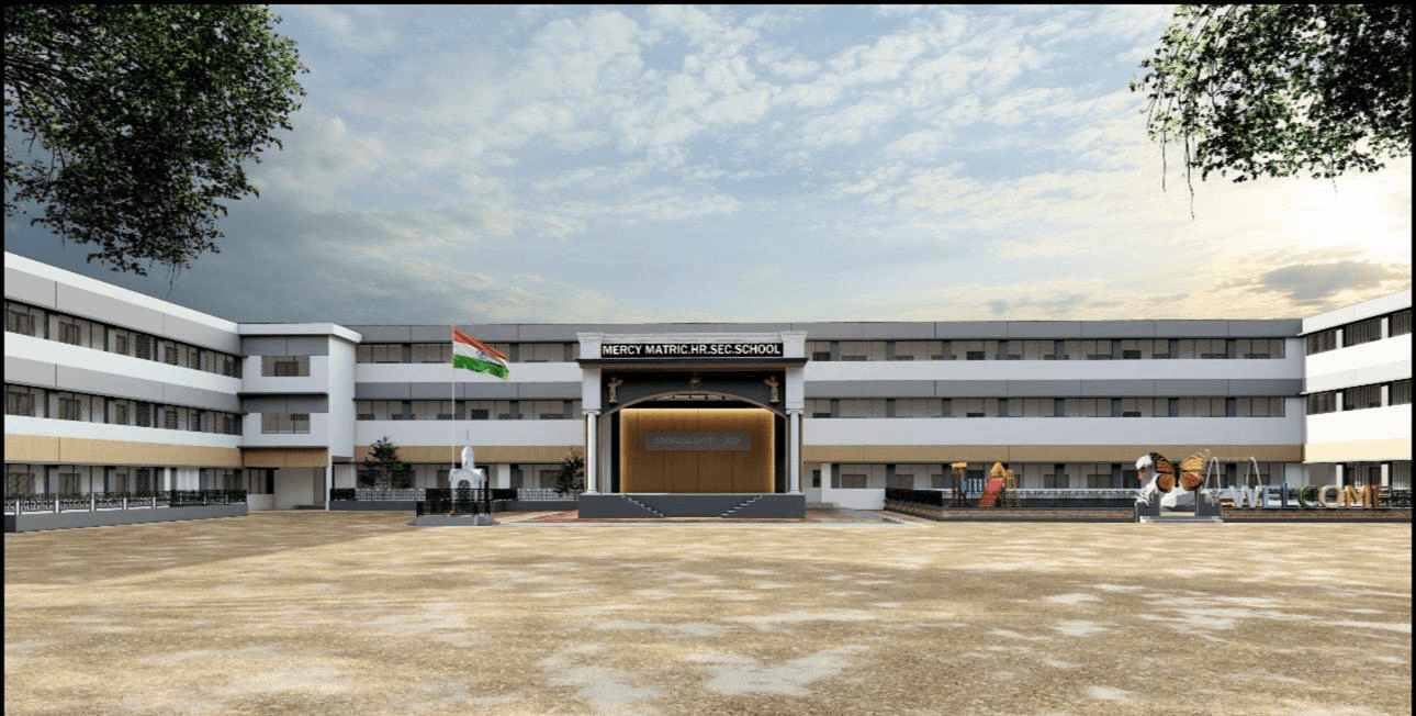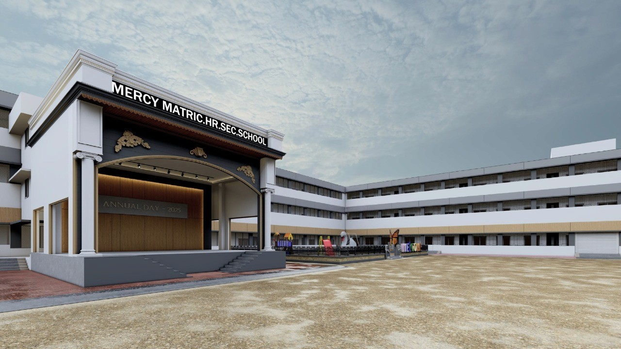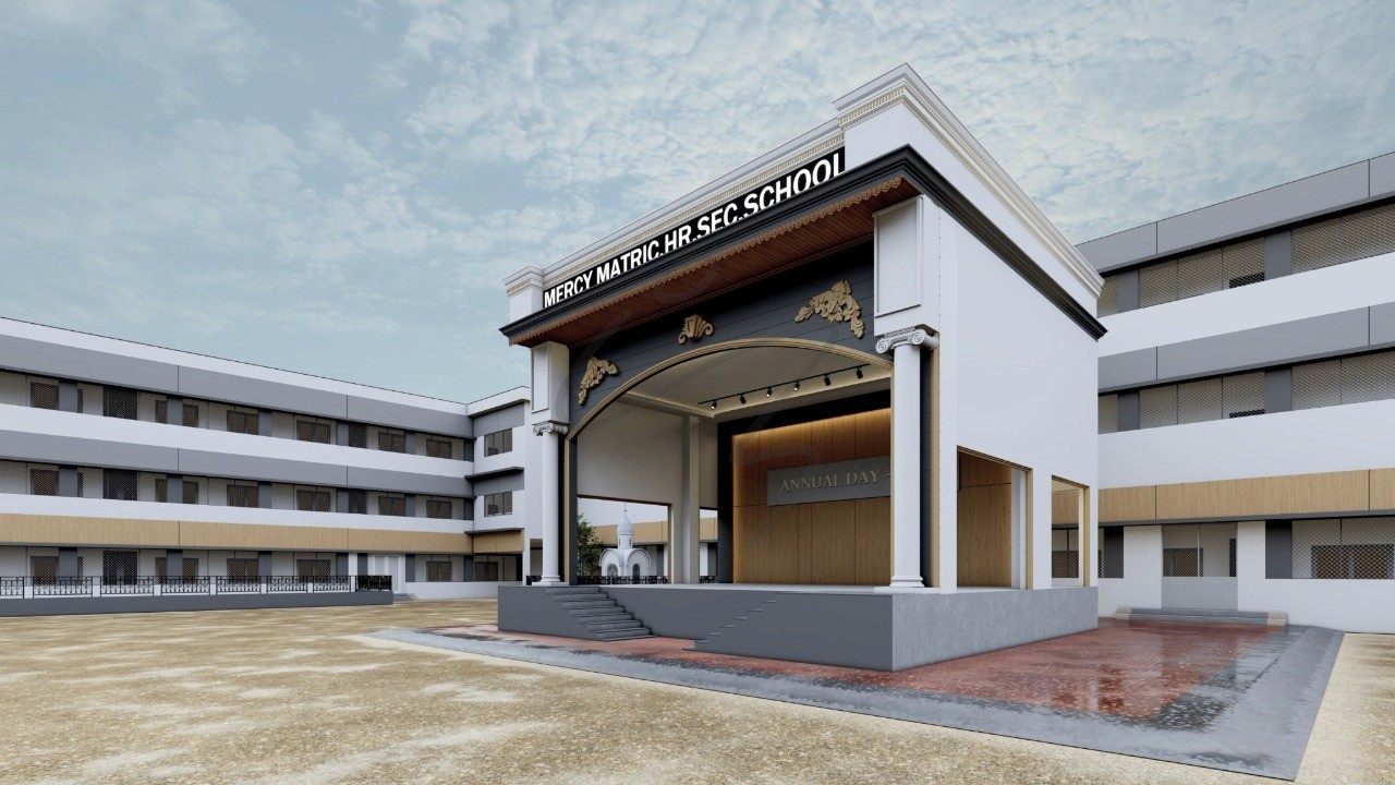 Mercy Matriculation Higher Secondary School is a thoughtfully planned campus centered around a courtyard with a grand stage, structured blocks, and landscaped play areas. Clean lines and balanced proportions create a safe, open, and timeless educational environment.